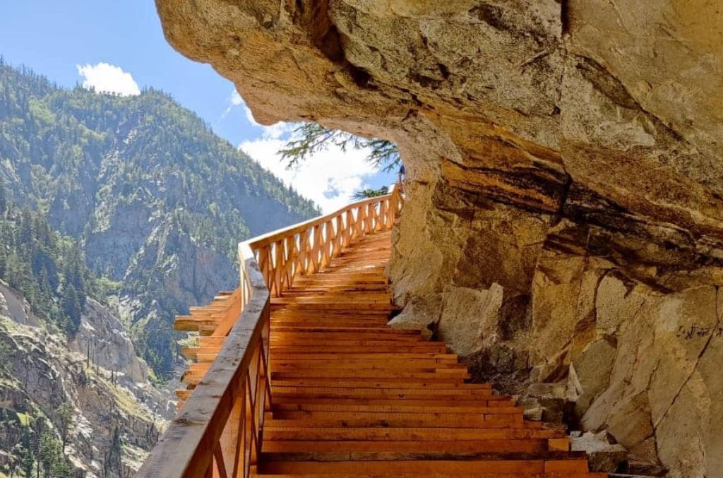 3 km climb through forests to reach the wooden cliff‑side walkway.